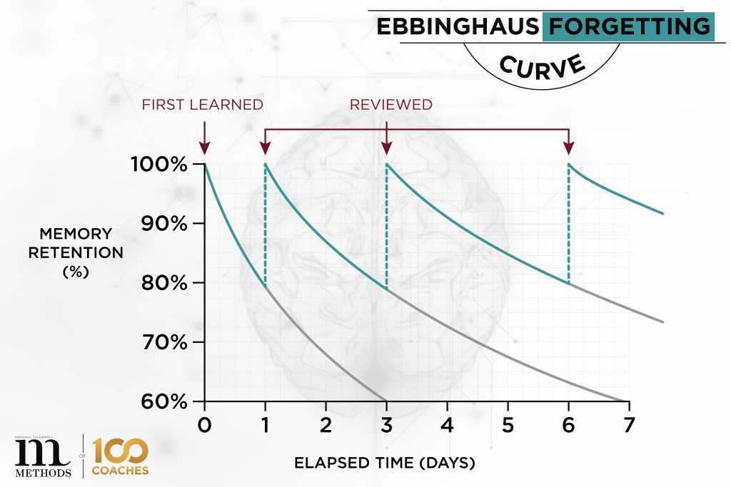 Ebbinghaus Forgetting Curve – It should also be mentioned that the more a piece of information is recalled, the easier it is to remember. That is visualized here in this graph. This makes logical sense. You can remember your name almost instantly because you have actively recalled it thousands of times in your life. It would be extremely difficult for you to forget your name, even if you hadn’t written it down in years.